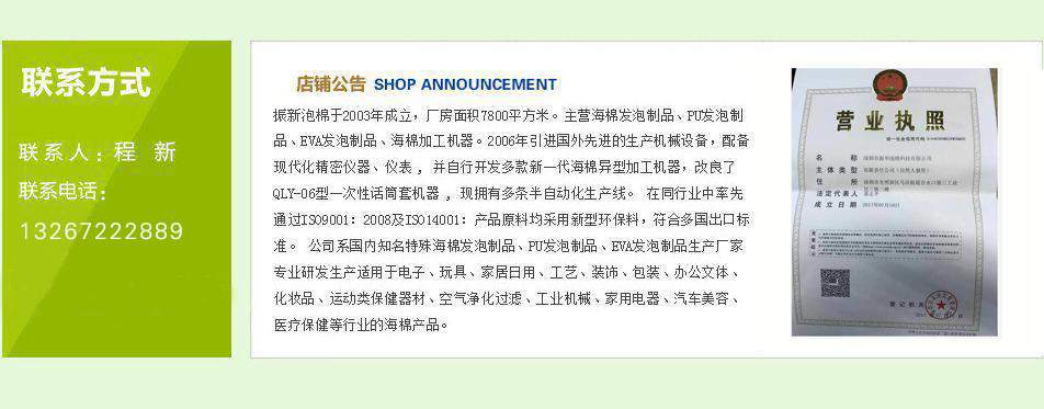 深圳市振新泡棉科技有限公司于2003年成立,廠房面積7800平方米。主營海棉發(fā)泡制品、PU發(fā)泡制品、EVA發(fā)泡制品、海棉加工機器。2006年引進國外先進的生產(chǎn)機械設備,配備現(xiàn)代化精密儀器、儀表 , 并自行開發(fā)多款新一代海棉異型加工機器,改良了QLY-06型一次性話筒套機器 , 現(xiàn)擁有多條半自動化生產(chǎn)線。 我們擁有一批經(jīng)驗豐富的工程技術人員和高級管理人員,在同行業(yè)中率先通過ISO9001:2008及ISO14001:產(chǎn)品原料均采用新型環(huán)保料,符合多國出口標準。 公司系國內(nèi)知名特殊海棉發(fā)泡制品、PU發(fā)泡制品、EVA發(fā)泡制品生產(chǎn)廠家,專業(yè)研發(fā)生產(chǎn)適用于電子、玩具、家居日用、工藝、裝飾、包裝、辦公文體、化妝品、運動類保健器材、空氣凈化過濾、工業(yè)機械、家用電器、汽車美容、醫(yī)療保健等行業(yè)的海棉產(chǎn)品。 產(chǎn)品的類型如:高密度聚酯海棉、普通海棉、異型定型海棉、防火/阻燃海棉、高回彈/慢回彈海棉、過濾網(wǎng)狀海棉、EVA玩具禮品、PU發(fā)泡定型玩具禮品等等。產(chǎn)品名稱如:耳機/話筒KTV海棉套、海棉圓球、洗刷海棉、吸水海棉、木漿海棉、化妝海棉、相機海棉、墨盒海棉、壓縮海棉、橡膠海棉、粗細孔過濾海棉、波峰隔音海棉、醫(yī)用海棉、海棉枕頭、包裝防震海棉、1mm厚海棉、電子/醫(yī)用海棉棉簽、EVA球、EVA智力拼圖、EVA鑰匙扣、PU座墊、PU公仔、PU球類等等。 我們還獲得多家國際知名廠商的授權資格,代理多品種家庭用品。 產(chǎn)品多年來一直銷往全球,深受廣大用戶和客商的青睞。